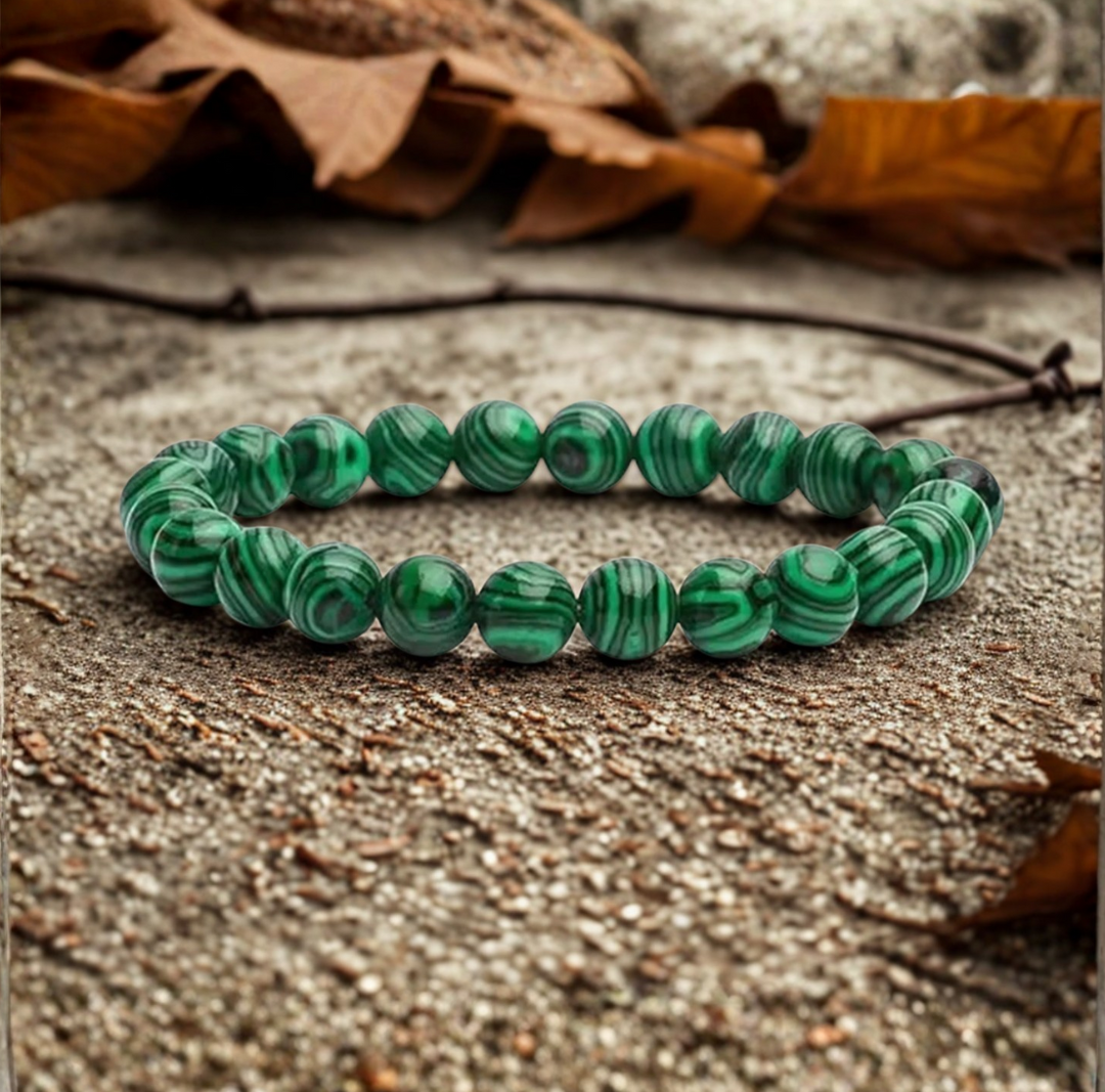 Bracelet en malachite naturelle, perles 8 mm. Pierre de transformation, de protection et d’ouverture du cœur.