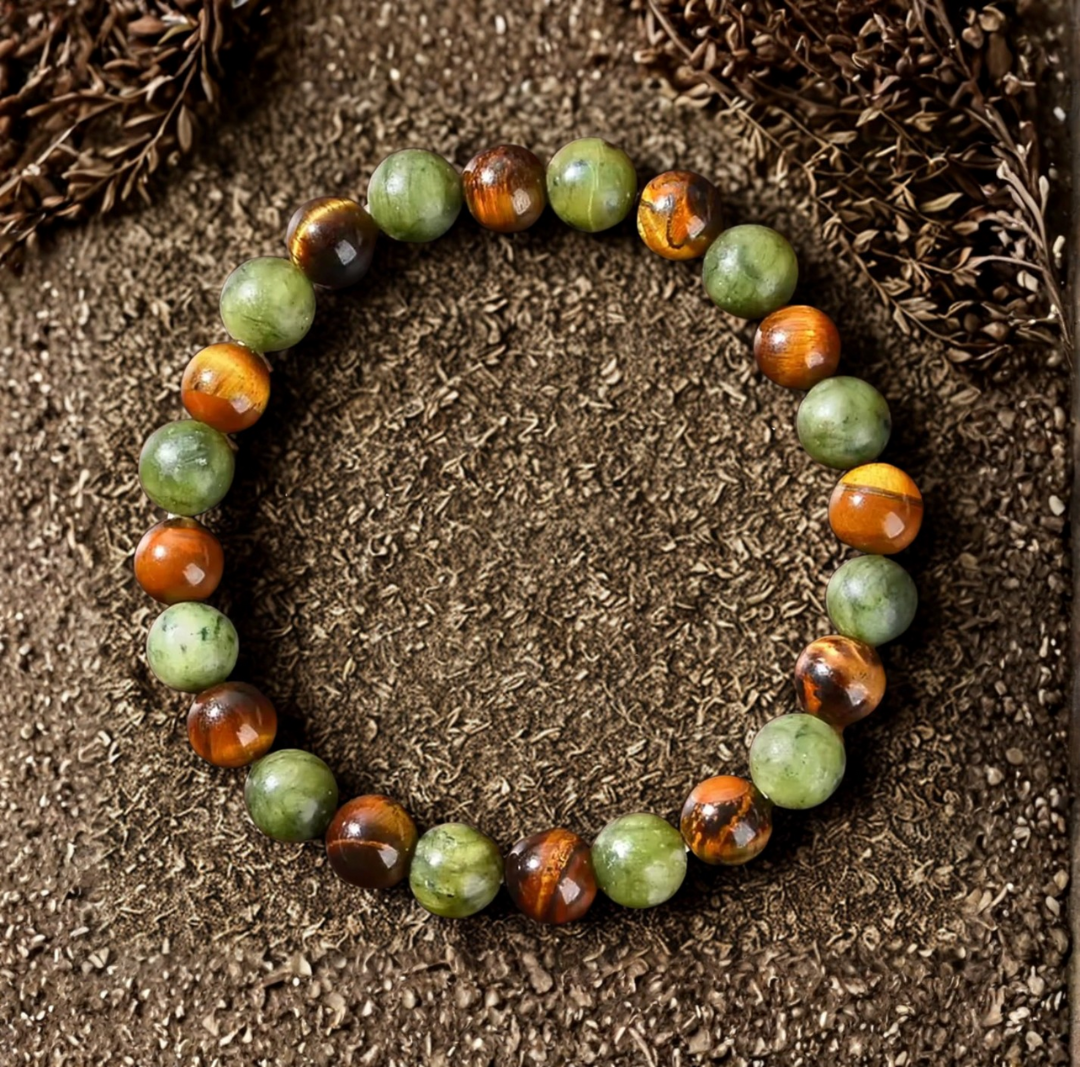 Bracelet en Œil de Tigre et Jade Vert – Force, Harmonie et Équilibre
