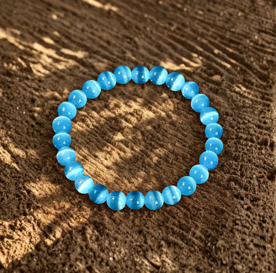 Bracelet en sélénite bleue naturelle, perles de 8 mm. Pierre apaisante favorisant la sérénité, la clarté mentale et la purification énergétique.