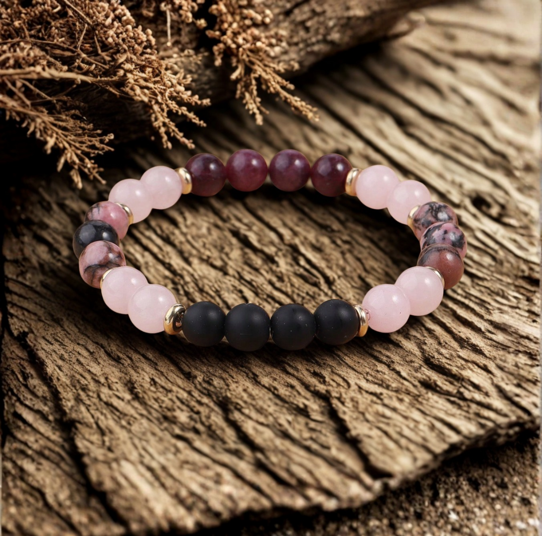Bracelet en Quartz Rose, Grenat, Rhodonite et Onyx Noir – Amour, Équilibre et Protection