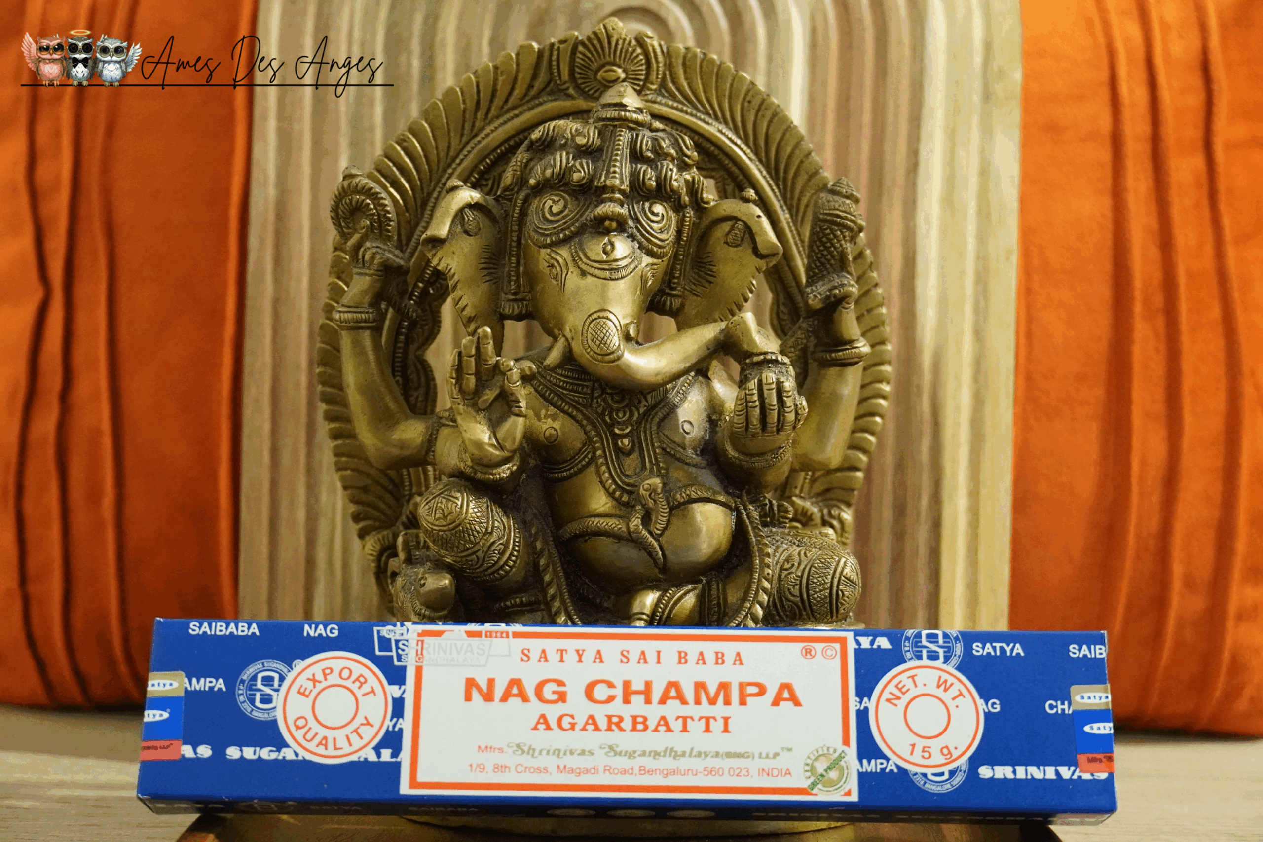 Le Nag Champa est une fragrance indienne contenant du Frangipani, du bois de Santal et de fleurs de champa séchées. « Nag Champa » signifie « Fleur aux serpents ». Elle a été nommée ainsi car elle aurait le pouvoir d’envoûter les serpents. Nagchampa equilibre les énergies, aide à la relaxation et au développement, offrande à Ganesh.