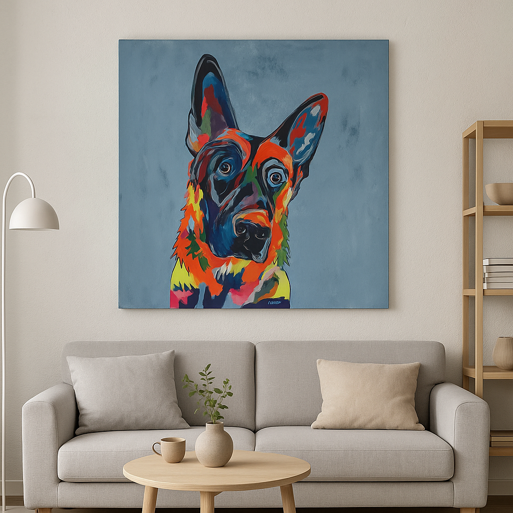 Le gardien des couleurs – Peinture acrylique originale signée Chantal. Portrait canin vibrant, aux couleurs éclatantes, idéal pour un intérieur moderne