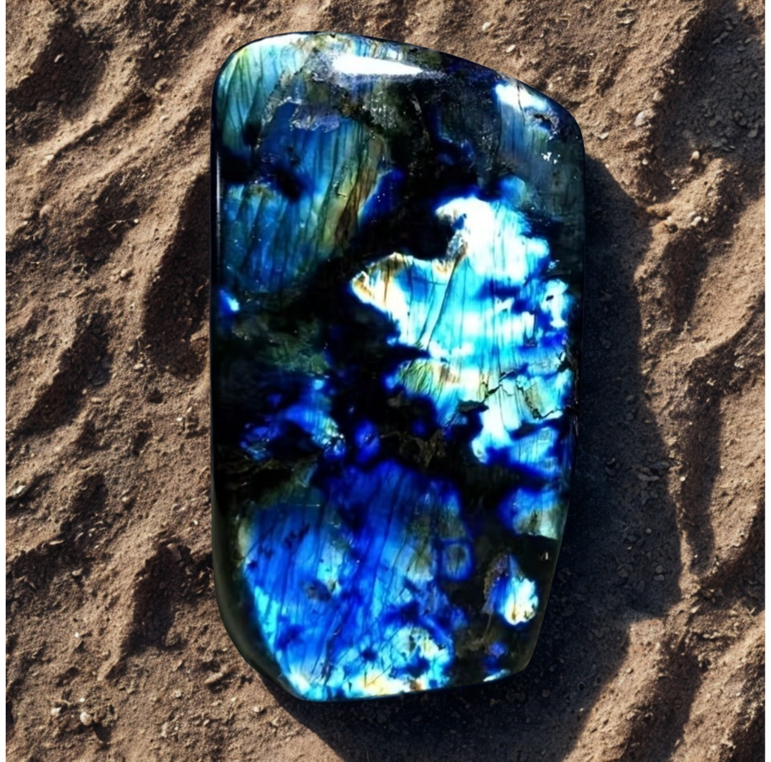 Pierre de labradorite naturelle polie de 400 à 500 g. Puissante pierre de protection, aux reflets bleus et dorés fascinants. Idéale pour la lithothérapie et la décoration.